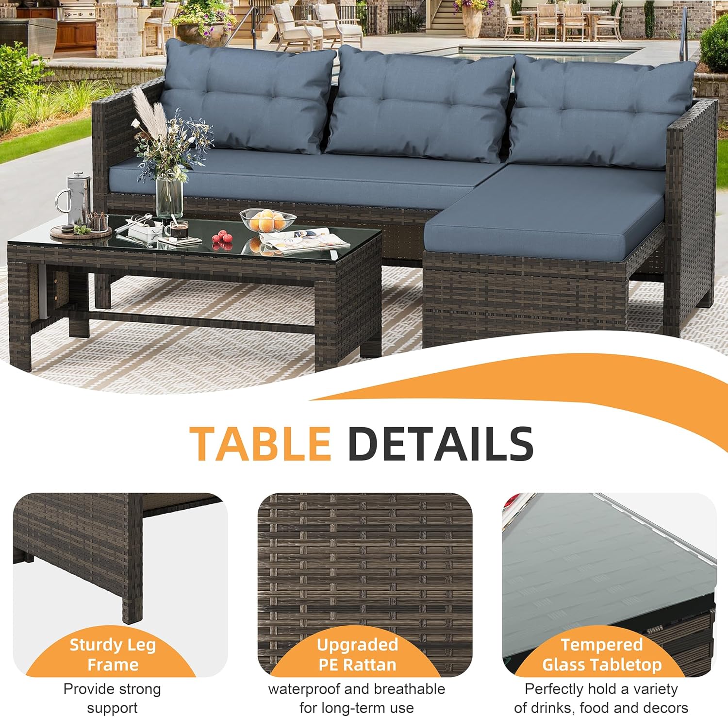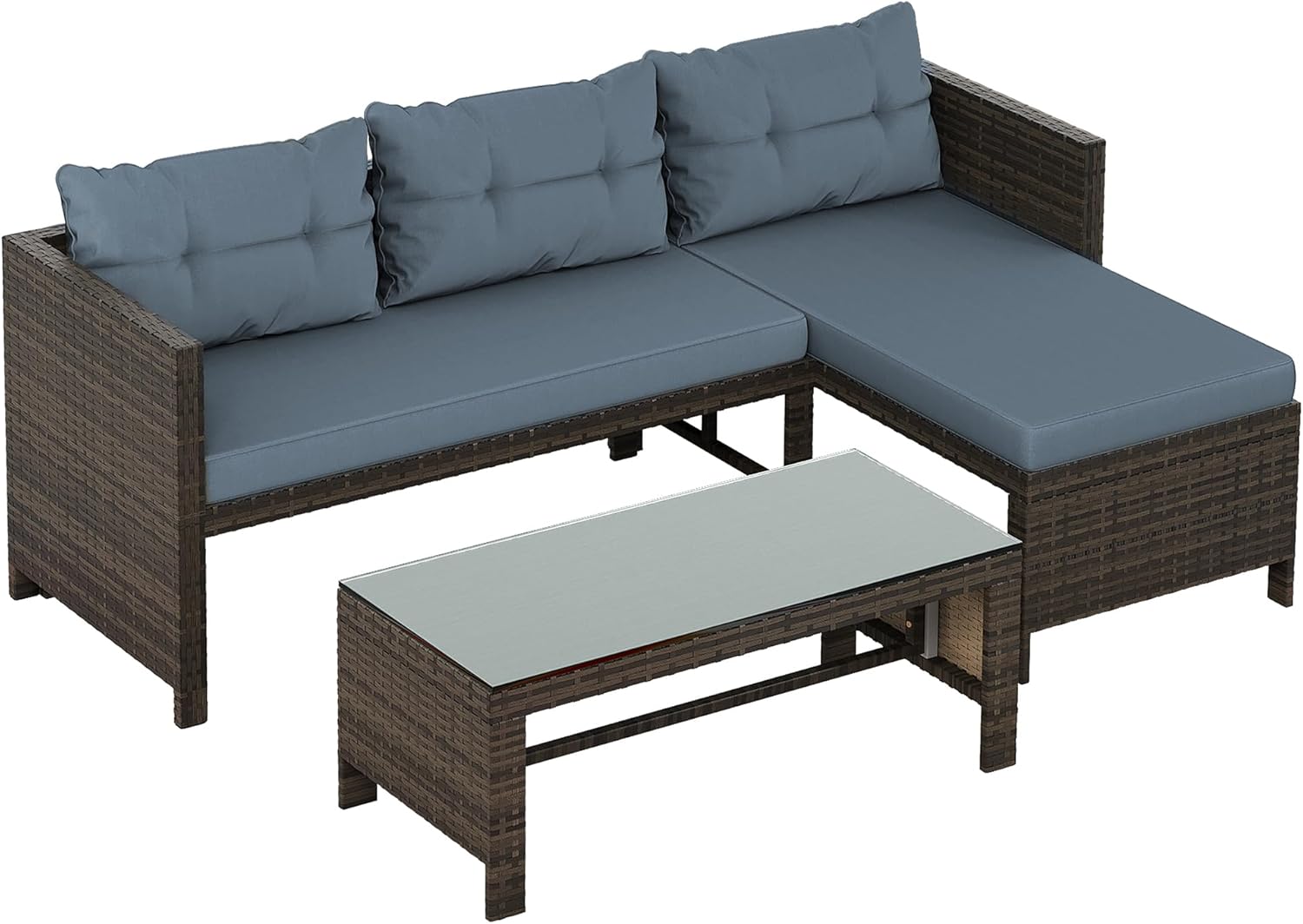 Shintenchi Outdoor Patio Furniture Sets, Wicker Patio sectional Sets 3-Piece, All Weather Wicker Rattan Patio Seating Sofas with Glass Coffee Table and Cushion (Blue)